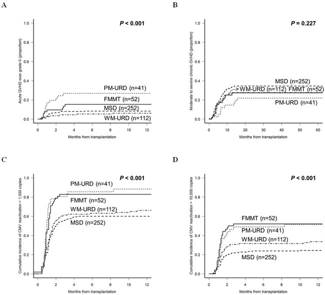 We analyzed the incidence of GVHD and CMV reactivation according to the donor types, except for AUTO-HCT. The incidence of acute GVHD ≥ grade II was higher in URD-HCT (48.8% in PM-URD and 47.3% in WM-URD) compared to FMMT (36.5%, p = 0.023) and MSD-HCT (34.6%, p = 0.021). However, the incidence of acute GVHD ≥ grade III was higher in PM-URD (29.3%) and FMMT (15.4%) compared to MSD-HCT (8.7%) and WM-URD (6.3%). As shown in Figure 3A, PM-URD had a significantly higher proportion of acute GVHD ≥ grade III compared to WM-URD and MSD (p < 0.001). The incidence of chronic GVHD was similar in all donor types (55.2% in MSD, 45.8% in WM-URD, 41.5% in PM-URD, and 56.3% in FMMT). Moderate to severe chronic GVHD also occurred at a similar rate in MSD (34.4%), WM-URD (27.8%), PM-URD (22.0%), and FMMT (27.3%) without a significant difference (Figure 3B, p = 0.227). We analyzed the incidence of CMV reactivation (defined as more than 1,000 copies/mL) and identified that PM-URD and FMMT showed a higher incidence of CMV reactivation compared to MSD and WM-URD (88.3% and 82.7% vs. 62.0% and 66.0%, respectively, p < 0.001) (Figure 3C). When CMV reactivation was defined as more than 10,000 copies/mL (Figure 3D), PM-URD and FMMT also showed a higher incidence of CMV reactivation compared to MSD and WM-URD (51.4% and 54.4% vs. 25.3% and 33.5%, respectively, p < 0.001).