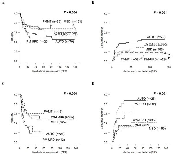 Figure 4: DFS and CIR rates according to the transplantation donor sources in the subgroup analysis. A. & B. Intermediate-risk subgroup. C. & D. Poor-risk subgroup.