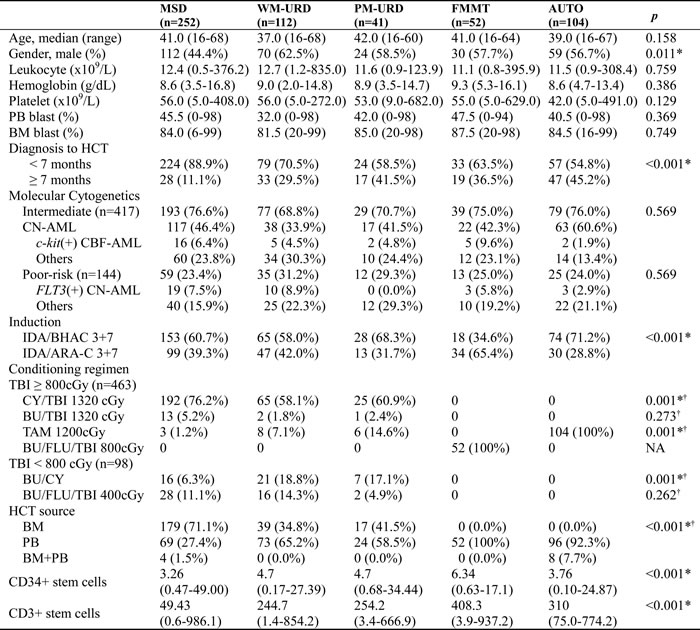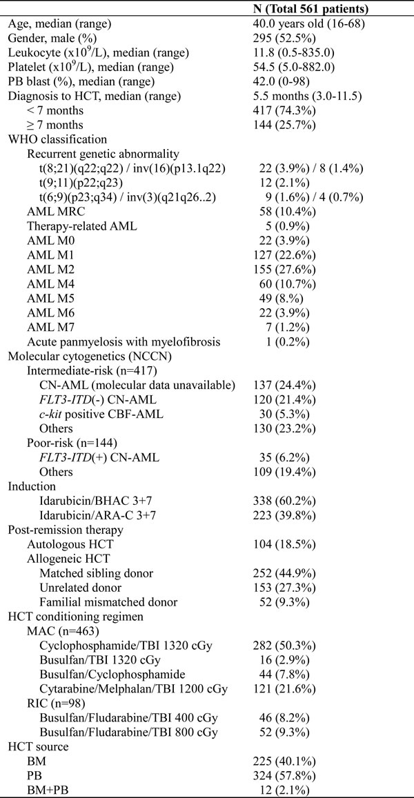 A consort diagram of the finally-selected 561 patients with intermediate- to poor-risk molecular cytogenetics is presented in Figure 1. All 561 patients underwent HCT in the first remission after intensive chemotherapy and the baseline characteristics are described in Table 1. Among them, there were 417 patients in the intermediate-risk group and 144 patients in the poor-risk group (Figure 1). The median age was 40 years old (range, 16-68 years old) and the median time to HCT was 5.5 months (range, 3.0-11.5 months). In 144 (25.7%) patients, the time to HCT exceeded 7 months. Among them, 68 patients had a slight delay (within 7.5 months) mainly due to the lack of transplantation facilities, 19 patients underwent numerous chemotherapy cycles (> 3 cycles with 2 month-interval) due to a delayed first CR, 10 patients had a delayed donor search, and 47 patients suffered from either delayed neutrophil recovery or infectious complications after prior chemotherapy. Among patients with core-binding factor-positive AML, c-kit mutations were identified in 30 patients who were then included in the intermediate-risk group. Among the 356 cytogenetically normal (CN)-AML patients, 64 (18.0%) with an isolated NPM1 mutation were classified into the favorable-risk group and excluded initially, while 137 (38.5%) patients without available molecular data and 120 (33.7%) NPM1-negative/FLT3-ITD-negative patients were classified into the intermediate-risk group. Thirty-five CN-AML patients with FLT3-ITD mutations (10.0%) were classified into the poor-risk group. For pre-transplant chemotherapy, 60.2% of patients were treated with an N4-behenoyl-1-β-D-arabinofuranosyl cytosine- (BHAC) based regimen and 39.8% of patients were treated with a cytosine arabinoside- (ARA-C) based regimen. AUTO was performed in 104 (18.5%) patients, MSD-HCT in 252 (44.9%) patients, URD-HCT in 153 (27.3%) patients, and FMMT in 52 (9.3%) patients. Among the patients treated with URD-HCT, 112 patients received stem cells from WM-URD and 41 from PM-URD. Almost half of the patients (50.3%) were treated with cyclophosphamide plus 1320 cGy of total body irradiation (TBI), while a reduced-intensity conditioning (RIC) regimen was used in 8.2% of patients, and 9.3% of patients were treated with an FMMT regimen.