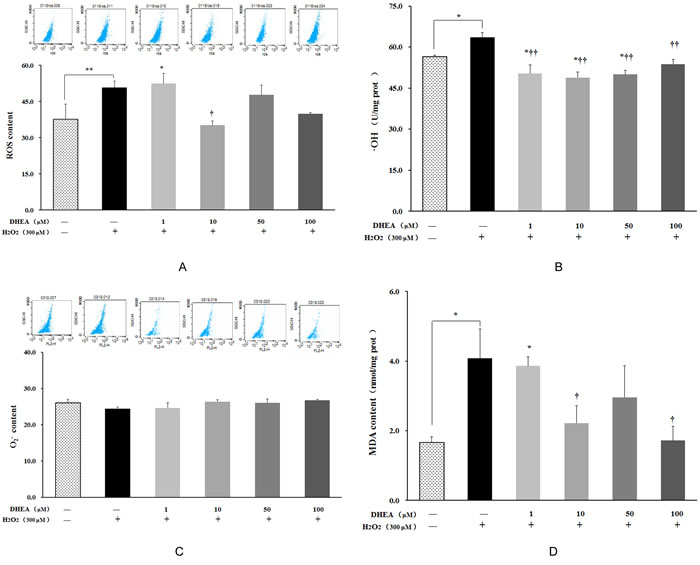 Figure 2: Impact of DHEA on oxidant generation and malondialdehyde content in H2O2-induced Leydig cells. Data are presented as means ± SD from three independent experiments, with six samples taken at each treatment group (n = 6). A. Reactive oxygen species (ROS) content; B. Superoxide anion (O2-); content C. Hydroxyl Radical (•OH) content; D. Malondialdehyde (MDA) content. *P < 0.05 and ** P < 0.01, relative to DHEA and H2O2-free control; † P < 0.05 and †† P < 0.01, relative to H2O2-induced control.