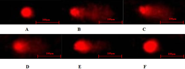 Figure 4: Typical DNA comet images of Leydig cells treated with DHEA and H2O2. A. control group; B. H2O2-induced control; C.-F. 1-100μM DHEA treatment group with 300μM H2O2-induced oxidation damage.