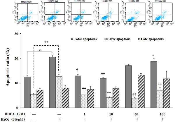 No differences were observed on late apoptosis ratio, while total apoptosis ratio and early apoptosis ratio were significantly increased in H2O2-treated group when compared to the H2O2-free control (P < 0.05) (Figure 5). Pre-treatment with 1-10μM DHEA significantly decreased total apoptosis ratio (P < 0.05) and 1-100μM DHEA significantly decreased early apoptosis ratio when compared to H2O2-treated group (P < 0.01), while no differences were observed on the late apoptosis ratio (P>0.05) (Figure 5).