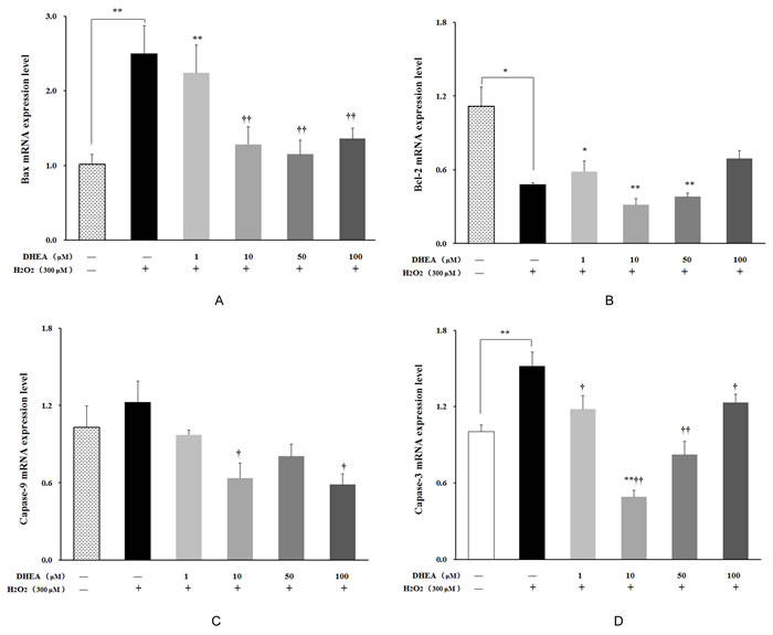 Figure 6: Effect of DHEA on Bax, Bcl-2, Capase-9 and Capase-3 mRNA levels in H2O2-induced Leydig cells. Data are presented as means ± SD from three independent experiments, with six samples taken at each treatment group (n = 6). A. Bax mRNA level; B. Bcl-2 mRNA level; C. Capase-9 mRNA level; D. Capase-3 mRNA level. *P < 0.05 and ** P < 0.01, relative to DHEA and H2O2-free control; † P < 0.05 and †† P < 0.01, relative to H2O2-induced control.