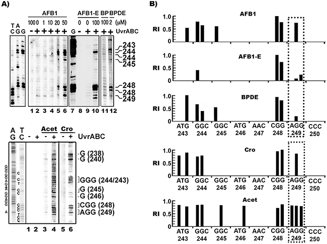 Figure 2: AFB1 as well as Acet and Cro induced bulky DNA damages in human hepatocytes are preferentially formed at 5’–GG- sequences, including the HCC p53 mutational hotspot codon 249. A. The bulky DNA damage distributions in the coding strand of exon 7 in HepG2 treated with AFB1, AFB1-E, Acet, and Cro were mapped by UvrABC/LMPCR, as described [36]. The corresponding codon numbers to the UvrABC incision band positions are indicated. Genomic DNA modified with BP diol epoxide (BPDE) in vitro (2 μM, 2 h at 37 °C) was included for comparison. AG, TC, and G are Gilbert reaction products [60]. B. Relative levels of AFB1, Acet, Cro, AFB1-E, and BPDE induced bulky DNA adducts formed at different sequences of the coding strand of exon 7. The positions of the individual codons are indicated below the sequence. Symbols: +/-, DNA treated with (+) and without (-) UvrABC nuclease. RI represents relative intensity.