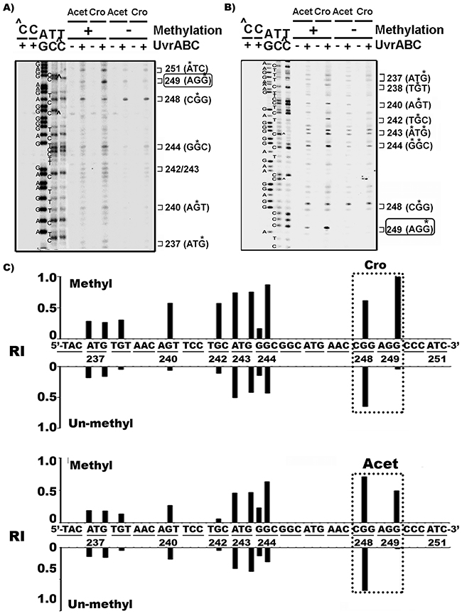 Figure 3: Cytosine methylation at codon 248 (-CGG-) of p53 gene sensitizes codon 249 (-AGG-) for Acet and Cro modifications. Single 5’-end A. or 3’-end B. 32P labeled exon 7 p53 DNA fragments were methylated with CpG methylase, as previously described [13, 61] then modified with Acet (100 μM, 1 h at 25 °C) and Cro (100 μM, 1 h at 37°C). PdG distributions in the fragments were mapped by the UvrABC incision method [26]. ∧C and C represent the methylated and unmethylated DNA fragments, respectively. * indicates the UvrABC incised base. C. The effect of methylation on Acet and Cro induced PdG formation. The relative levels of PdG formation at different sequences of 3’-end 32P-labled exon 7 of p53 gene fragments with (Methyl) and without (Un-methyl) CpG methylation as shown in (B) were quantified as described [13, 36]. RI represents relative intensity. Note: CpG methylation greatly enhances Acet- and Cro-induced PdG formation at codon 249.