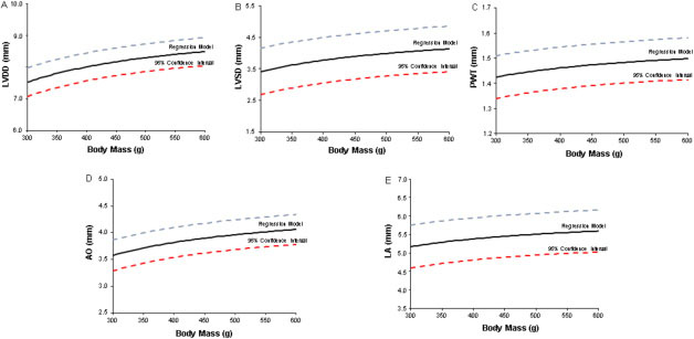 Figure 1: Regression models and 95% confidence intervals for (A) left ventricular (LV) end-diastolic diameter (LVDD), (B) LV end-systolic diameter (LVSD), (C) LV diastolic posterior wall thickness (PWT), (D) aortic diameter (AO), and (E) left atrial diameter (LA) in accordance with Wistar rat body weight. Straight line: regression model; dashed lines: superior and inferior 95% confidence intervals.