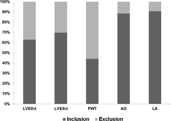 Figure 2: Percentages of echocardiographic parameters falling within regression model 95% confidence intervals for prospectively evaluated Wistar rats with body weights ranging from 300 to 600 g (n = 43). LVDD: left ventricular (LV) end-diastolic diameter, LVSD: LV end-systolic diameter, PWT: LV diastolic posterior wall thickness, AO: aortic diameter, LA: left atrial diameter.