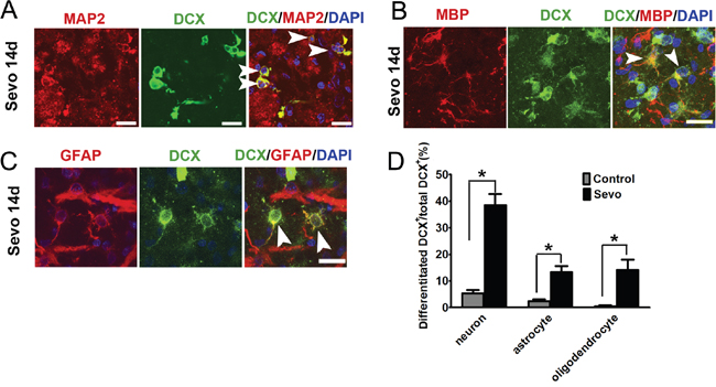 Figure 2: Sevoflurane preconditioning accelerated neuroblasts differentiated into neurons, astrocytes, and oligodendrocytes in the infarct. A. Image showing DCX+ cells that have differentiated into MAP2-positive mature neurons in the infarct in the Sevo group on day 14. Scale bar, 10μm. B. DCX+ cells differentiated into MBP-positive oligodendrocytes in the infarct in the Sevo group on day 14. Scale bar, 10μm. C. DCX+ cells differentiated into GFAP-positive astrocytes in the Sevo group on day 14 (white arrow indicates newborn astrocytes). Scale bar, 10μm. D. Comparison of differentiation ratio of DCX+ cells into neurons or glial cells in the infarct in the Sevo and Control groups; *P<0.05, n=8.