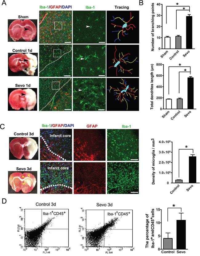 Figure 4: Sevoflurane preconditioning accelerated microglia activated. A. Comparison of the morphology of Iba-1 stained microglia in the Sevo group with those in Sham and Control groups on day 1. Boxed area indicates magnified region of the middle panels. Scale bar, 40 μm and 10 μm. B. Comparison of branching and total dendritic length of microglia across Sham, Control and Sevo groups; *P<0.05, n=8. C. Iba-1 stained microglia density in the infarct region both in the Sevo and Control groups on day 3. Dotted lines delineate the boundary of the infarct and the peri-infarct. Yellow arrows indicate the blurry region. Scale bar, 20μm. Histgram showed quantification of microglia density in the infarct on day 3. *P<0.05, n=8. D. Brain cells analyzed by flow cytometry displayed patterns of Iba-1 and CD45 expression between the Sevo-and Control-group, The percentages of Iba-1+ and CD45+ microglia over total cells were quantified and were significantly different; *P<0.05, n=8.