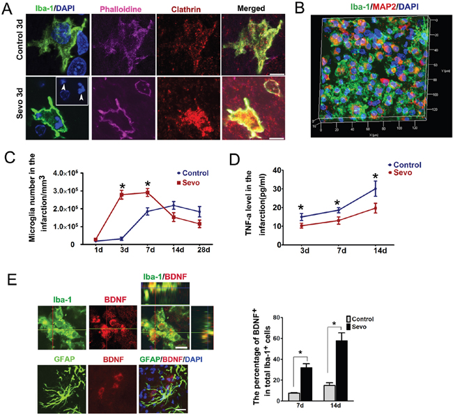 Figure 5: Sevoflurane preconditioning strengthened microglial phagocytosis and secretion of BDNF activities. A. Phalloidin, Clathrin and Iba-1 stained microglia in the infarct in the Sevo and the Control groups on day 3 (Arrows indicate nuclear debris), Scale bar, 5μm. B. Three-dimensional image of inclusion of Iba-1 stained microglia and MAP2 debris in the infarction region in Sevo group on day 3. Histogram represented comparison of activated microglia that phagocytized cell debris between the two groups in the infarct on day 3; #*P<0.05, n=8. C. Comparison of ameboid microglia counts in the infarct between the two groups on days 1, 3, 7, 14 and 28; *P<0.05, n=8. D. Comparison of TNF-a expression determined by ELISA in the infarct between the two groups on days 3,7 and 14 ; *P<0.05, n=8. E. Ortho image demonstrating BDNF secretion by microglia in the infarct in Sevo group, Scale bar, 10μm; Histogram showed comparsion of BDNF-positive microglia in the infarct region in the Sevo group and the Control group on days 7 and day 14; *P<0.05; Representative image showed BDNF was not secreted by GFAP positive astrocytes in the infarct in the Sevo group. Scale bar, 40μm.