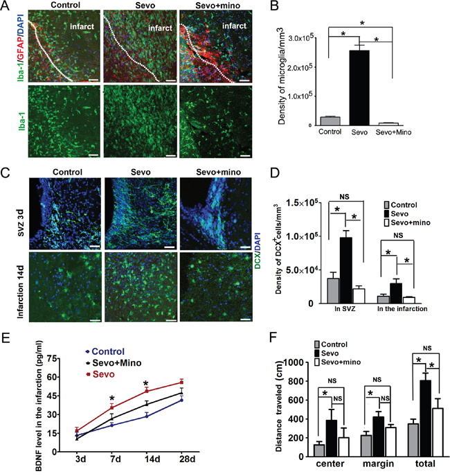 Figure 6: Inhibition of microglia activity by minocycline decreased DCX+ cells proliferation and migration. A. Iba-1 immunostained microglia in the Control, Sevo and Sevo+mino-treated groups in the infarct on day 3. B. Comparing the number of microglia in the infarct of Sevo+mino-treated with that in the Sevo and Control groups. Scale bar, 20μm. One-way ANOVA, post-hoc, *P<0.05, n=8. C. DCX+ cells in the SVZ of Control, Sevo and Sevo+mino-treated group. D. Comparing the number of DCX+ cells of Sevo+mino-treated with that in the Sevo and Control groups, *P<0.05;NS=Non Significant, n=8. E. Comparison of BDNF expression determined by ELISA in the infarct of Control, Sevo and Sevo+mino-treated groups on days 3, 7, 14 and 28; *presentive Sevo vs Control and Sevo vs Sevo+mino, P<0.05, n=8. F. In the open-field task,. Comparison of the distance traveled of Control, Sevo and Sevo+mino-treated groups on days 28; *P<0.05; NS=Non Significant; n=8.