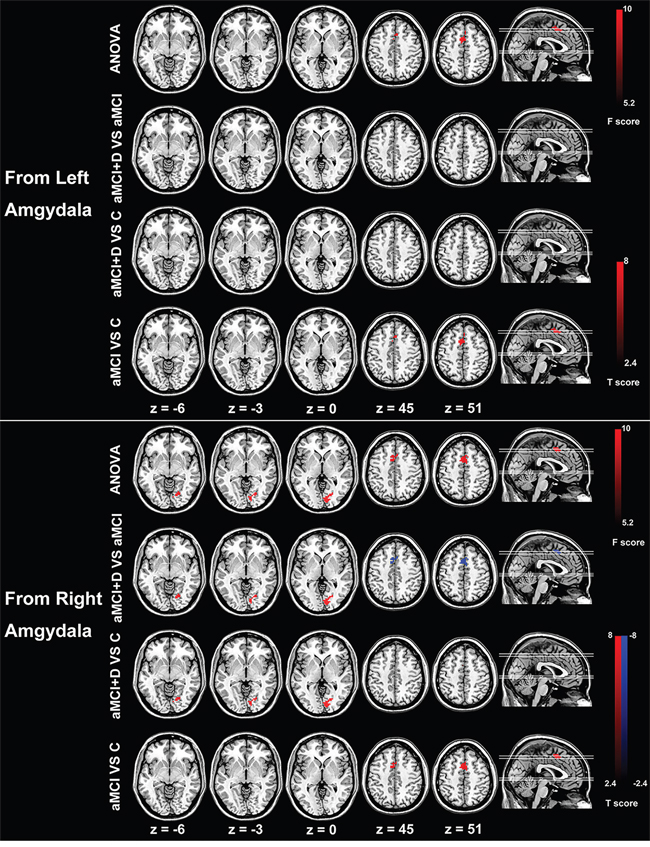 Table 2: Significantly altered directional connectivity from and to bilateral amygdala and hippocampus in MDD-aMCI and aMCI patients