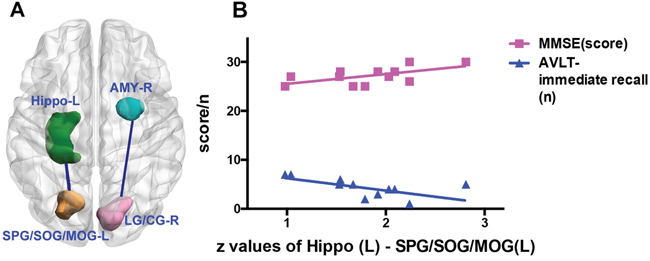 Figure 3: Scatter plots between the extracted z values based on the left hippocampus and neuropsychological scales. Brain regions with the green, blue, yellow and pink coded color stand for the left hippocampus, right amygdala, left superior parietal gyrus / superior and middle occipital gyrus (SPG/SOG/MOG) and right lingual and calcarine gyrus (LG/CG), respectively (Figure 3A). Based on the seed of the left hippocampus, the z values of effective connectivity from the left SPG/SOG/MOG to the hippocampus correlate with the scores of MMSE and the numbers of AVLT-immediate recall in the MDD-aMCI group (Figure 3B). Pearson correlation analyses reveals that the z values of the effective connectivity from the left SPG/SOG/MOG to the left hippocampus negatively correlate with the scores of AVLT-immediate recall (r=-0.626, P=0.029), and positively correlate with the scores of MMSE (r= 0.594, P=0.042) (Figure 3B).