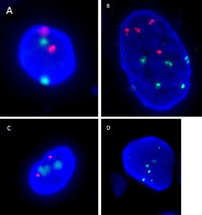 Figure 1: Representative FISH images are shown for (A) a normal urothelial cell with diploidy of chromosomes 3 (red signal) and 7 (green signal), (B) a cell with polyploidy of chromosomes 3 and 7, (C) a normal urothelial cell with diploidy of p16 genes (red signal) and chromosome 17 (green signal), and (D) a cell with polyploidy of chromosome 17 and homozygous deletion of p16 genes.