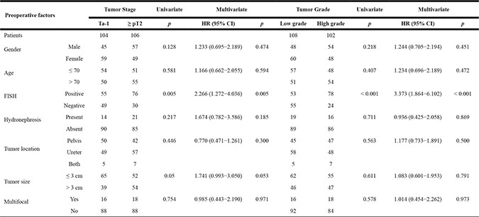 The clinical and pathological characteristics of the patients are listed in Table 1 and are stratified according to the FISH results. There were 102 male and 108 female patients with a median age of 70.5 years (inter-quartile range [IQR]: 63–75 years). The diagnosis of urothelial carcinoma was pathologically confirmed in all patients; 104 had non-muscle-invasive diseases (≤ pT1), and 106 had muscle-invasive diseases (≥ pT2), while 108 had low grade and 102 had high grade diseases. Conservative surgeries were performed in 21 patients; 7 of the patients had non-muscle-invasive (≤ pT1) and 14 had muscle-invasive (≥ pT2) UTUC, and 12 had low grade and 9 had high grade diseases.