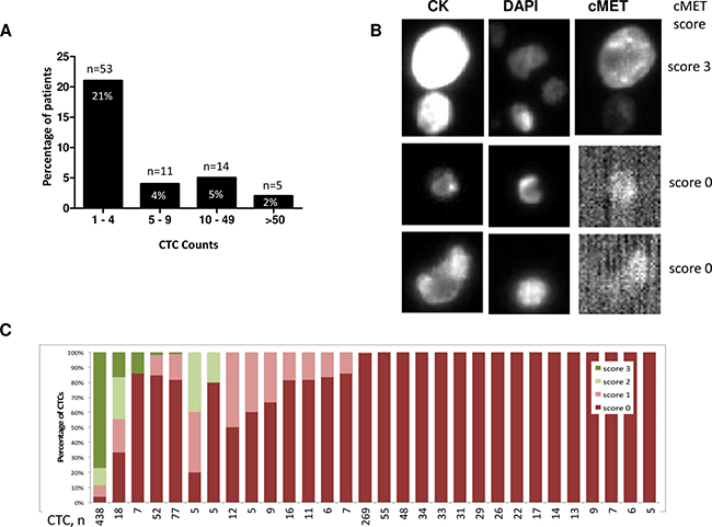 Figure 1: CTC enumeration and MET protein staining in blood samples evaluated on the CellSearch system. (A) Distribution of CTC counts per 7.5 ml blood in 256 patients, indicating the number and percentage of patients in each CTC enumeration subgroup (173 patients with CTCs = 0 are not shown). (B) Representative examples of MET protein staining in CTCs. Upper panel, CTC exhibiting strong MET expression (score 3+), medium and bottom panels, no MET staining detected (score 0). (C) Distribution of MET scores in CTCs from patients with ≥ 5 CTCs/7.5 ml, n = total number of CTCs detected in each sample.