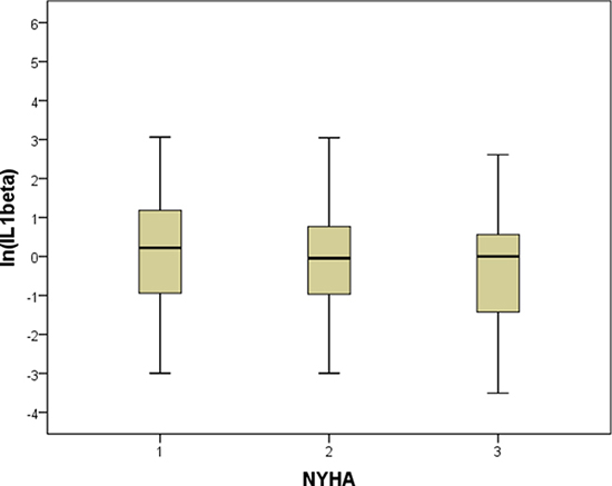 Figure 1: Levels of IL-1β in patients with NYHA functional class I to III. The bottom and top of the box represent the first and third quartiles, and the band inside the box is the median. Lines extending vertically from the boxes (whiskers) indicate variability outside the upper and lower quartiles, i.e. respectively the lowest value still within 1.5 IQR (interquartile range) of the lower quartile, and the highest value still within 1.5 IQR of the upper quartile.