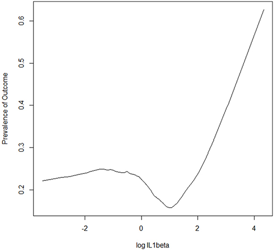 Figure 3: Relationship between IL-1β concentration and outcome. Plot of smoothed estimates of (natural) log values of IL-1β concentration on the x-axis vs. rates of outcome on the y-axis. The “plsmo” function of the R library “Hmisc” has been used to generate the plot; locally-weighted polynomial regression is used to generate the depicted curve.