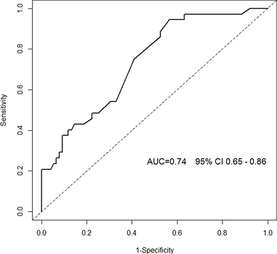 Figure 4: Time-dependent ROC curve of the multivariable model. Area under the Curve (AUC) with corresponding 95% CI (confidence interval) is depicted: to calculate AUC we used as a marker the risk of event estimated by the multivariable model and as time-horizon events within 96 months of follow up. Inverse Probability of Censoring Weighting (IPCW) is used to account for the censoring mechanism. Technical details about time-dependent ROC computation can be found in [20].