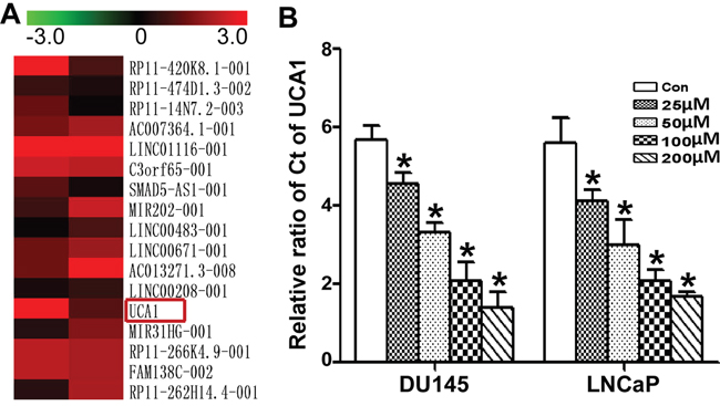 Figure 2: Comparison of the change in lncRNAs in PCa with ATR treatment. A. The heat map shows part of lncRNA profile comparison in DU145 cells between the untreated group and the IC50 ART group. The most differentially down-expressed lncRNA was UCA1. B. After treatment with gradient concentrations (from 25 to 200 μM) of ART for 24 h, the UCA1 level in DU145 and LNCaP cells was measured by qRT-PCR. The valid qRT-PCR results indicated that ART inhibited UCA1 expression in a dose-dependent manner, which correlated well with the microarray data.