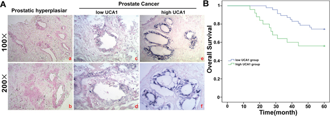 Figure 3: UCA1 is over-expressed in PCa tissue. A. ISH analysis of UCA1 in the 72 cases of PCa tissue and 30 cases of hyperplastic prostate tissue using qRT-PCR. The difference is P = 0.000. B. Kaplan-Meier survival analysis of 67 EC patients, comparison is based on high and low miR-301 expression groups (P = 0.025).