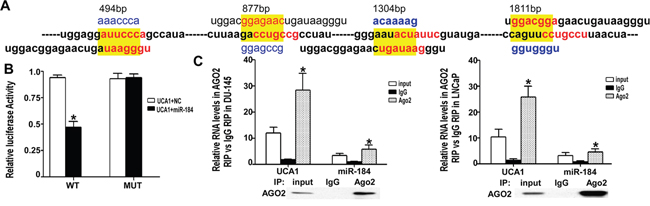 Figure 4: UCA1 regulated miR-184 as a ceRNA. A. There were 4 binding sites between UCA1 and miR-184. The WT and mutated sequence are highlighted in red and yellow, respectively. B. The luciferase activity of WT was significantly decreased compared with NC, but for the MUT group there were no significant differences with NC (* indicates P < 0.05). C. After over-expression of UCA1 for 24 h, the total protein of DU145 and LNCaP cells was extracted and incubated with IgG or AGO2 antibody. Then, qRT-PCR was performed to analyze the relative levels of UCA1 and miR-184. For the AGO2 group, the UCA1 and miR-184 levels were significantly higher than in the IgG group (* indicates vs IgG group, P < 0.05).