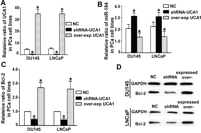 Figure 5: UCA1 regulated miR-184 and its target. A. After over-expression and knock down of UCA1 for 24 h in DU145 and LNCaP cells, we detected the UCA1 level with qRT-PCR, and the over-expression group was more than 30, correspondingly the shRNA group was less than 0.5 (* indicates P < 0.05). B. UCA1 influenced the miR-184 level in DU145 and LNCaP cells by qRT-PCR. The higher the UCA1 level was, the lower the miR-184 level, and vice versa. (* indicates P < 0.05). For the Bcl-2 level, the tendency was the opposite of miR-184. UCA1 indirectly up-regulated the expression of Bcl-2 at both the mRNA C. and protein D. levels.