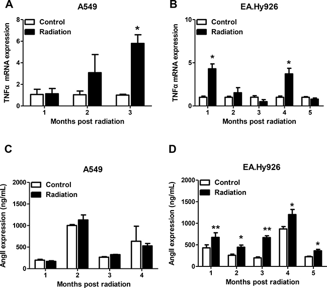 Figure 2: Effects of radiation on TNF-α and Ang II mRNA expression. (A) Significantly higher TNF-α mRNA expression was observed three months after irradiation in A549 cells. (B) TNF-α mRNA levels increased significantly at one and four months after irradiation in EA.Hy926 cells. (C) No significant Ang II mRNA expression changes were observed after radiation exposure in A549 cells. (D) Compared with control cells, Ang II expression increased significantly in EA.Hy926 cells one to four months after radiation exposure. *P < 0.05 compared to the control group; **P < 0.01 compared to the control group.