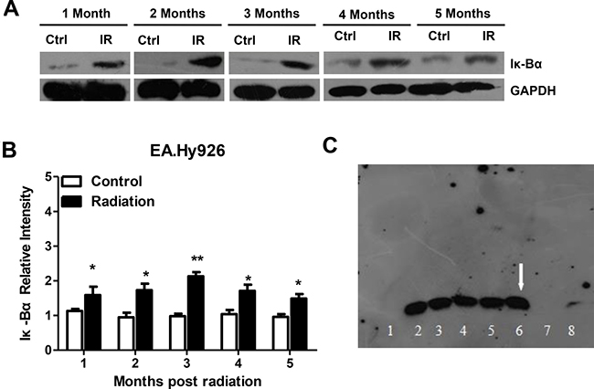 NFκB is a transcription factor that regulates the expression of a number of genes involved in pathophysiological states such as inflammatory disorders. In the resting state, NFκB remains inactive in the cytosol by tightly binding to the specific inhibitor of κBα (IκBα) [18]. In response to multiple stimuli in pathophysiological conditions, IκB molecules are phosphorylated, ubiquitinated and then degraded, thus releasing their inhibition on NFκB [9]. To examine whether NFκB activation status in EA.Hy926 cells is affected by radiation, nuclear proteins were extracted at different time points after the last irradiation and Iκ-Bα protein levels and NF-κB activity were examined by western blotting and EMSA assay, respectively. Compared with non-irradiated, control cells, Iκ-Bα protein levels were significantly elevated from one to five months after radiation (Figure 3A and 3B). EMSA assay showed that NF-κB activity was also activated in EA.Hy926 cells after radiation (Figure 3C).