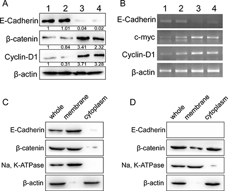 Total cellular mRNA was extracted from fresh RCC tissues using RNAiso Plus Reagent (TaKaRa, Japan) and reverse-transcribed with 1st Strand cDNA Synthesis Kit (TaKaRa, Japan) according to the introduction. The RNA concentration was determined by Thermo Scientific NanoDrop 2000 detector. Total of 5 μg mRNA was used for RT-PCR. Primers for E-cadherin, cyclinD1, c-myc and β-actin used in our study were listed as below: CDH1-forward: AAAGGCCCATTTCCTAAAAACCT; Reverse: TGCGTTCTCTATCCAGAGGCT. CCND1-forward: CAA TGACCCCGCACGATTTC; Reverse: CATGGAGGGC GGATTGGAA. MYC-forward: CACACCCACAATTC AGGAAGAG; Reverse: GACGTGCTACAAGGTGGCA. ACTB-forward: TTTTGGCTATACCCTACTGGCA; Reverse: CTGCACAGTCGTCAGCATATC. RT-PCR was performed with a One Step RT-PCR Kit Ver.2 (TaKaRa, Japan). Each quantity of mRNA expression was corrected by corresponding β-actin mRNA expression.