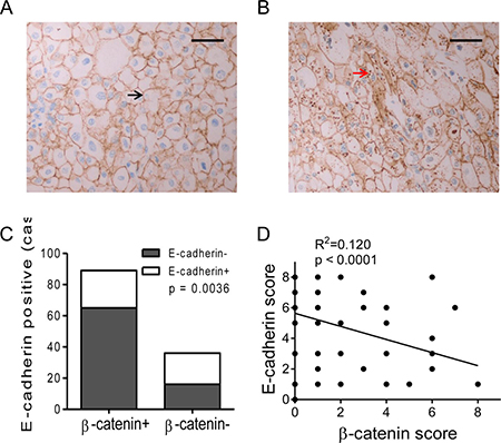 Figure 1: E-cadherin expression and prognosis value in RCC. (A, B) E-cadherin expression images of RCC specimens. Positive E-cadherin expression was located on the membrane (A, black arrow) and negative E-cadherin expression image (B). Bar, 50 μm. (C, D) Kaplan-Meier analysis of disease-free survival (DFS, C) and Overall survival (OS, D) of RCC patients according to E-cadherin expression status.