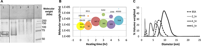Figure 1: (A) SDS-PAGE of pure BSA (lane 1) and BSA-HA conjugate solutions at a 1:5 molar ratio of HA:BSA after 3, 7 and 21 hours (lane 2,3 and 4, respectively) of incubation at 60°C. Lane 5 depicts the standard MW markers. Molecular mass (B) and particle size distribution (c) in solutions of BSA-HA conjugates at a 1:5 molar ratio. [BSA-HA conjugates] = 1.2 mg protein/ml.