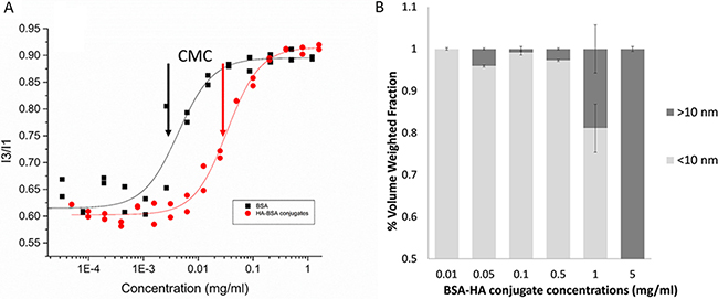Figure 2: (A) Pyrene fluorescence I3:I1 ratio (386 and 374 nm, respectively) vs. BSA and BSA-HA conjugates concentration. [Pyrene] = 1.02 μM; excitation wavelength: 338 nm. The lines were obtained by model fitting based on Equations 1 and 2. Arrows represent the CMC: CMC (BSA) = (0.0041 ± 0.0008) mg/ml; CMC (HA-BSA conjugates) = (0.033 ± 0.002) mg/ml; (B) Volume weighted size distributions as a function of BSA-HA conjugates concentration.