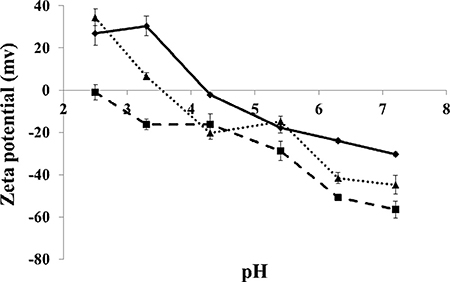 Nicomp 380 ZLS analyzer was used for zeta potential measurements of BSA, HA and BSA-HA conjugates. Samples were dissolved at 20 mM Phosphate/phosphate-citrate buffers at pH values of 2.5–7.2 and a concentration of 0.6 mg protein/ml and stirred overnight.
