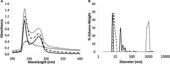 Figure 4: (A) Absorbance spectra of non-encapsulated PTX (20 μM, gray), BSA-HA conjugates at 1 mg protein/ml (solid black line), and of PTX in BSA-HA conjugates at 1 mg protein/ml (black, dashed line) compared to a mathematical summation (dotted line) of the absorbance spectra of non-encapsulated PTX and of the conjugate solution. DMSO concentration was 1.5 %. The molar ratio of PTX : BSA-HA conjugates was 2:1. (B) Particle size distribution determined using DLS, in solutions of BSA-HA conjugates (black, dashed line), non-encapsulated PTX (40 μM, gray) and of PTX-loaded BSA-HA NPs (solid black line) at the same concentrations of the respective components. The molar ratio of PTX:BSA-HA conjugates was 2:1.