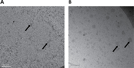 Figure 5: Cryo-TEM images of (A) BSA-HA conjugates (40 μM) without PTX. The grainy surface indicates BSA-HA conjugates (small arrows) and larger gray stains indicate self-assembled aggregates of BSA-HA conjugates (large arrows). (B) 2:1 molar ratio of PTX (80 μM) with BSA-HA conjugates; All samples contained 0.8% DMSO in PBS. The molar ratio of PTX and BSA-HA conjugates was 2:1. PTX aggregates and nanocrystals were coated with BSA-HA conjugates adsorbed to their surfaces (arrows in Figure 5B).