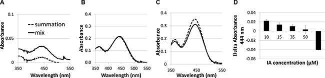 Figure 6: Absorbance spectra of imidazoacridinone C-1375 (A) 10 μM, (B) 50 μM, (C) 65 μM in BSA-HA conjugate (mix) at 1 mg protein/ml (solid black line) compared to a mathematical summation (dotted line) of the absorbance spectra of pure C-1375 and pure conjugate solutions at the same concentrations as in the mix; (D) Delta Absorbance (mix –sum) at 444 nm at different C-1375 concentrations.