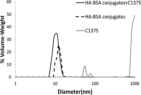 Figure 8: Particle size distribution determined using DLS, in solutions of BSA-HA conjugates (black dashed line), non-encapsulated IA C-1375 (80 μM, gray) and of C-1375 loaded BSA-HA NPs (solid black line) at the same concentrations of the respective components. The molar ratio of C-1375:BSA-HA conjugates was 2:1.