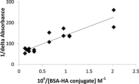 Figure 9: Benesi-Hildebrand plot (1/delta absorbance as a function of 106/BSA-HA molar concentration, Eq. 3) to determine the C-1375 - BSA-HA conjugates association constant.