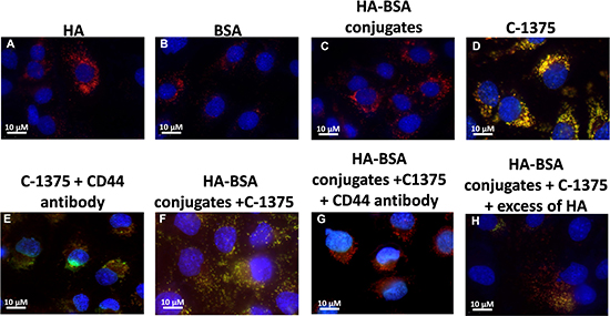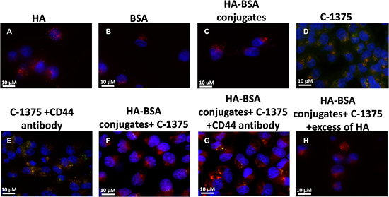 Figure 11: Ovarian carcinoma A2780 cells were incubated with the following samples: (A) HA; (B) BSA; (C) HA-BSA conjugates; (D) C-1375; (E) C-1375 with CD44-blocking antibody; (F) HA-BSA loaded with C-1375; (G) HA-BSA loaded with C-1375 + CD44 antibody; (H) HA-BSA loaded with C-1375 + free HA (molar ratio of free HA to conjugated HA was 100:1) for 1 hr at 37°C; BSA-HA NPs loaded with C-1375 (10 μM) were added for 2 hr prior to fluorescence cell imaging (anti-CD44 antibody at a final concentration of 10 μg/ml was added for 1 hr prior to BSA-HA conjugates). LysoTracker red DND99 (100 nM) was added for 1 hr prior to fluorescence cell imaging. The viable DNA dye Hoechst 33342 (2 mg/ml) was added immediately prior to microscopic analysis. Cells were then photographed using the Cell-Observer microscope at ×630 magnification.