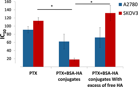 Figure 13: IC50 of PTX and that of PTX encapsulated within BSA-HA conjugates, for SKOV3 cells and A2780 cells with or without the addition of excess free HA. Molar ratio of free HA to conjugated HA was 100:1; * denotes a P-value lower than 0.05.