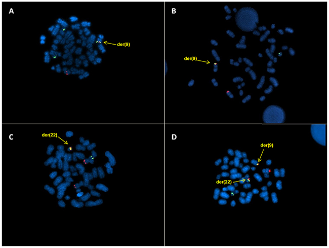 Figure 1: DCDF FISH analysis showing: A. 1R2G1F signal pattern and the BCR/ABL fusion gene on der(9); B. 1R1G1F signal pattern and the BCR/ABL fusion gene on der(9) C. 2R1G1F signal pattern and the BCR/ABL fusion gene on der(22); D. 1R1G2F signal pattern and the BCR/ABL fusion genes on der(9) and der(22).