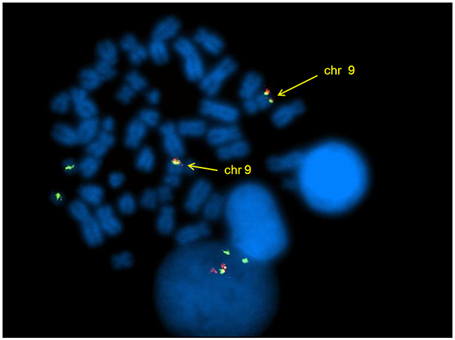 Moreover, 2 patients (n.1 and 3) (33,3%) harbored deletions adjacent to the BCR and/or ABL breakpoints: on both der(9) and der(22) chromosomes in patient n.1 and on der(9) in patient n.3. During the disease progression of the patient n.2, FISH analysis revealed the appearance of a second clone characterized by two fusion BCR/ABL and two BCR signals, that gradually replaced the first clone with only one fusion signal. The clonal evolution was concomitant with the increase of transcript detected by RQ-PCR. By FISH analysis on metaphase, the 2 fusion signals were observed on both chromosomes 9 (Figure 2), suggesting the duplication of BCR/ABL rearrangement, as sign of clonal evolution.