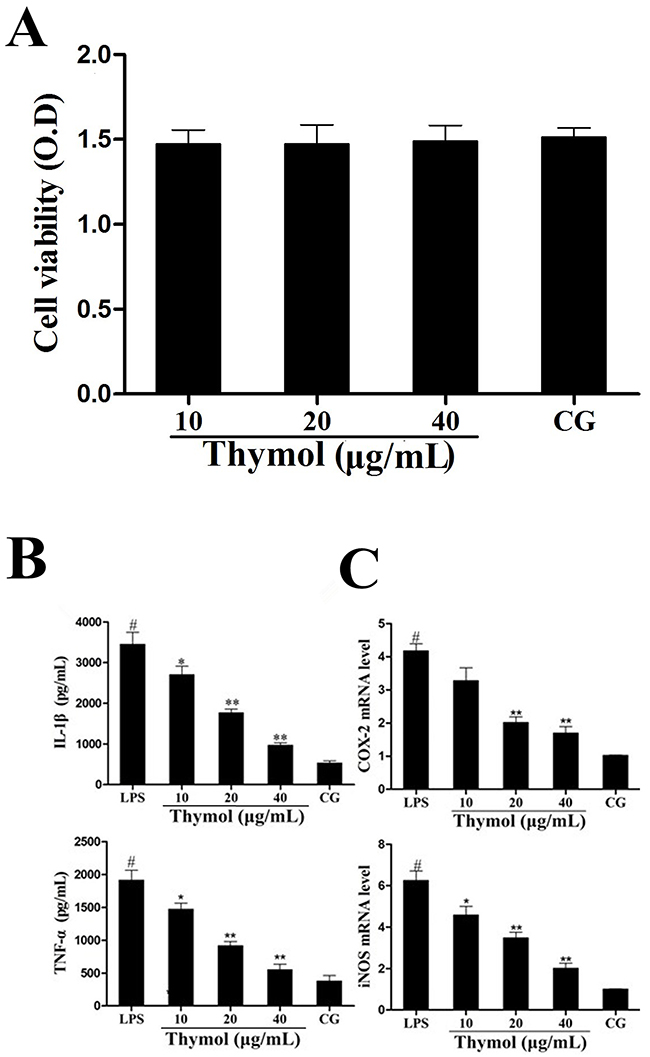 Figure 6: A. Effect of thymol on the cell viability of RAW264.7 cells. B. Effects of thymol on the expression of TNF-α and IL-1β in LPS-stimulated RAW264.7 cells. C. Expression of iNOS and COX-2 mRNA in LPS-stimulated RAW264.7 cells. GAPDH served as the control. CG indicates the control group. LPS indicates the LPS-stimulated group. Data represent the mean ± S.E.M. of three independent experiments. #p<0.01 vs. Control group. *p<0.05 vs. LPS group, **p<0.01 vs. LPS group.