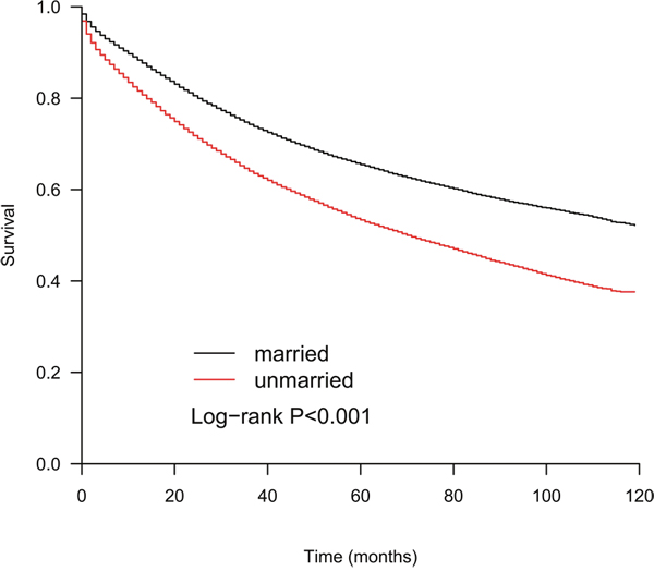 Using the SEER database, we identified 71,955 patients who underwent colectomy for colon adenocarcinoma. Kaplan-Meier curves showed that the median OS of the unmarried group was significantly shorter than that of the married group (70months vs more than 120months). When we performed a multivariate analysis with an extended Cox model, we found that the unmarried patients carried a 1.37-fold increased risk of all-cause deaths compared with the married patients, and this risk remained constant over time. Further analysis showed that being unmarried was at a higher risk of death from colon adenocarcinoma as well as death from other causes.