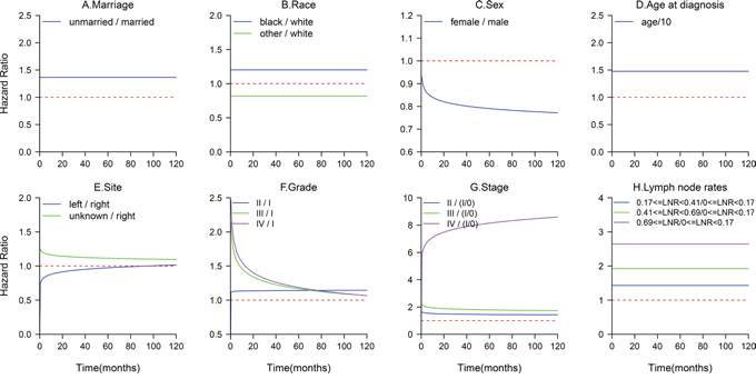 b:we conducted non-proportionality test in univariate analysis with Cox PH model, and we identify that sex, marriage, tumor site, tumor grade, tumor stage, lymph node rates were time-dependent factors (p<0.05). But when we conducted non-proportionality test in multivariate analysis with Cox PH model, we identify that marriage, lymph node rates satisfied the PH assumption (p>0.05).
