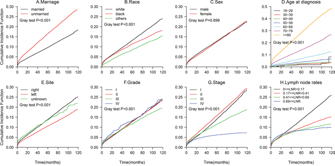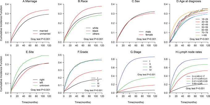 The results from the multivariate Fine and Gray competing risks regression model are shown in Table 3. The CIF curves are plotted in Figure 3. The 5-year cancer-specific mortality rate was 24.76% for the married patients and 30.01% for the unmarried patients (p<0.001). Marital status was a significant independent predictor of colon cancer death, with an 20.7% increased risk of cancer-specific mortality for the unmarried patients compared with that for the married patients(HR,1.21; 95%CI, 1.17-1.24; p<0.001). The unmarried patients also had a greater probability of death from other causes (data not shown, Figure 4). An older age, being black, being male, having a right-side tumor, and a higher grade or TNM stage were associated with an increased risk of death from colon cancer (all p<0.001), findings that were similar to the results of the all-cause mortality analysis.