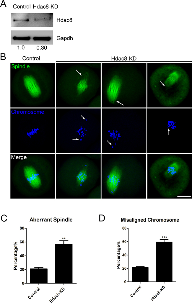 Figure 2: Depletion of HDAC8 causes spindle and chromosome abnormalities. A. Protein levels of HDAC8 in control and HDAC8-KD (siRNA microinjected) oocytes. The blots were probed with anti-HDAC8 antibody and anti-Gapdh antibody, respectively. B. Representative images of spindle morphologies and chromosome alignment in control and HDAC8-KD oocytes. Oocytes were immunostained with anti-α-tubulin-FITC antibody to visualize spindles and counterstained with Hoechst to visualize chromosomes. Scale bar, 20μm. C. The rate of aberrant spindles was recorded in control and HDAC8-KD oocytes. Data were presented as mean percentage (mean ± SEM) of at least three independent experiments. Asterisk denotes statistical difference at a p < 0.05 level of significance. D. The rate of misaligned chromosomes was recorded in control and HDAC8-KD oocytes. Data were presented as mean percentage (mean ± SEM) of at least three independent experiments. Asterisk denotes statistical difference at a p < 0.05 level of significance.
