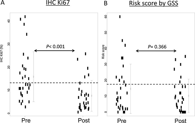 Figure 2: IHC Ki67 levels and web-based risk scores before and after short-term hormone therapy. (A) The IHC Ki67 level was defined as the percentage of Ki67-positive cells. The dotted line shows the cutoff IHC Ki67 level at 13.25%. (B) The web-based risk score was simulated [17]. The dotted line shows the cutoff for low and intermediate risk groups. P values were calculated by the Wilcoxon test.