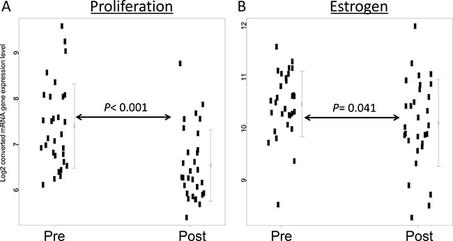 Next, we compared pre- and post-hormone therapy expression levels of four genes (ER, PgR, HER2, and Ki67) that are used clinically to inform breast cancer treatment strategies. Next, we measured expression changes of genes involved in key biological markers and functions using the 21-gene assay to investigate the effect of short-term hormone therapy on these genomic markers. The 21-gene assay was composed genes involved in four biological functions (Proliferation: MKI67, STK15, Survivin, CCNB1, and MYBL2; Invasion: MMP11 and CTSL2; HER2: GRB7 and HER2; Estrogen: ER, PGR, BCL2, and SCUBE2), three independent genes (GSTM1, CD68, and BAG1) and five reference genes [12]. We compared the average pre- and post-hormone therapy gene expression levels of each biological function and of the four genes.